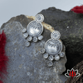 Make a statement with these bold antique silver earrings, handcrafted with intricate detailing and adorned with white accent stones. The oxidized finish gives them a rustic, vintage appeal, while the dangling elements add a touch of movement and charm. The fusion of traditional motifs with contemporary design makes these earrings a must-have for any jewelry lover.
